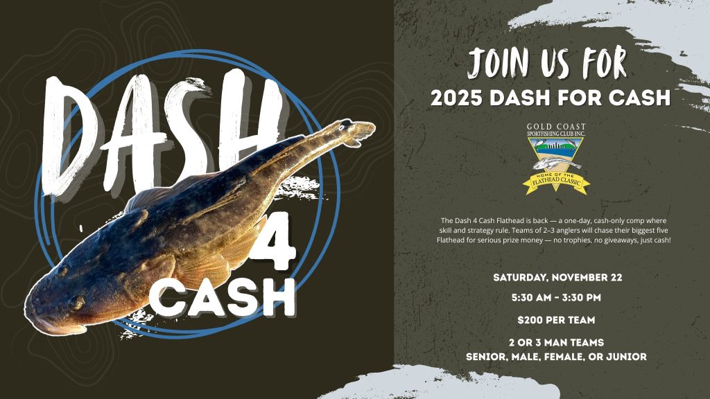 The Dash 4 Cash Flathead is back — a one-day, cash-only comp where skill and strategy rule. Teams of 2–3 anglers will chase their biggest five Flathead for serious prize money — no trophies, no giveaways, just cash!Launch from anywhere, but no fishing before 5:30 am. It’s lure or fly only, with casting or trolling allowed. All entries and results go through the Track My Fish app, and all fish must be submitted by 3:45 pm.Boundaries are the same as the Flathead Classic — from the Highway Bridge at Nerang to the Pin Bar.
